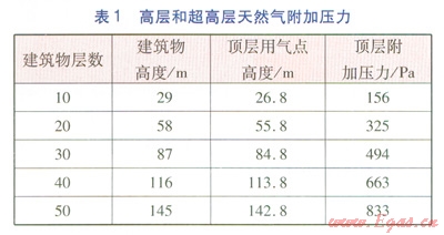 根據(jù)式(1),住宅層高按2.9m計(jì)算,對(duì)高層或超高層住宅,使用天然氣時(shí)的附加壓力計(jì)算結(jié)果見表1(頂層用氣點(diǎn)高度按樓板高度加0.7m計(jì))。