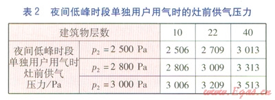 根據(jù)式(4),居民用氣中—低壓調(diào)壓設(shè)施出口壓力p2分別為2500、2800、3000Pa時(shí),在夜間低峰時(shí)段,僅有某戶居民用氣時(shí),其燃具前供氣壓力計(jì)算結(jié)果見表2。