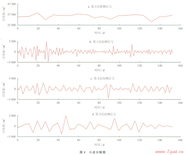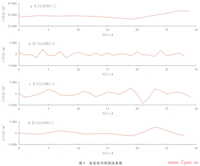 1)采用快速Mallat算法對實(shí)際采集的天然氣日負(fù)荷時(shí)間序列進(jìn)行小波分解,分解出第3層低頻序列、第1層高頻序列、第2層高頻序列、第3層高頻序列。