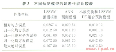 天然氣日負(fù)荷預(yù)測的常用模型有LSSVM預(yù)測模型、ANN預(yù)測模型,將筆者所建立的小波變換和LSSVM-DE組合預(yù)測模型與上述兩種常用的預(yù)測模型進(jìn)行對比,采用的定量評價(jià)方法為國際上普遍采用的5種誤差評價(jià)方法,分別為相對均方誤差、歸一化均方誤差、歸一化絕對平方誤差、歸一化均方根誤差、最大絕對誤差,具體公式叮參照本文參考文獻(xiàn)[15]。定量評價(jià)結(jié)果見表3,定性評價(jià)結(jié)果見圖7。