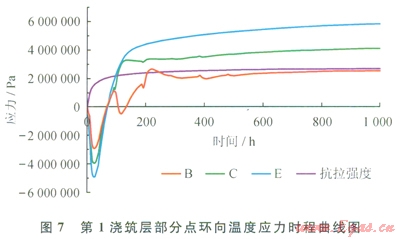 圖7為第l澆筑層部分點環(huán)向溫度應力時程曲線。由圖7可知,在外罐施工期間,混凝土先受壓后受拉,在混凝土澆筑68h后,混凝土由受壓狀態(tài)轉(zhuǎn)變?yōu)槭芾瓲顟B(tài),在混凝土澆筑120h后,第1澆筑層底部某點所受拉應力超過了混凝土的抗拉強度,底部混凝土開始產(chǎn)生溫度裂縫。B點應力曲線存在上下波動是由于B點易受上層新澆筑混凝土的影響;比較B、C、E點應力時程曲線可知,混凝土離罐底越近,產(chǎn)生的溫度應力越大。