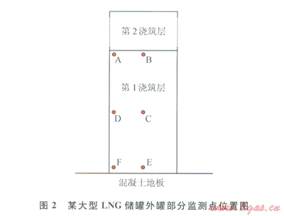 以山東某液化天然氣接收站的一個160000m3大型LNG儲罐混凝土外罐為例進行數(shù)值計算,混凝土外罐內(nèi)徑為41m,外徑為41.8m,壁厚為0.8m,高為41.1m?;炷镣夤薹?/span>ll層進行澆筑,其中1~9層澆筑高度為4m,第l0層澆筑高度為l.5m,第ll層環(huán)梁澆筑高度為2.6m,模板采用20mm膠合板,相鄰施工層時間間隔為4d。由于結(jié)構的對稱性,取罐壁的四分之一(相鄰扶壁柱之間部分)進行有限元分析(圖1),外墻地板采用固定端約束,由于扶壁柱對外墻的約束,在其兩側(cè)面上施加對稱彈性約束。監(jiān)測點分布位置如圖2所示。