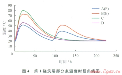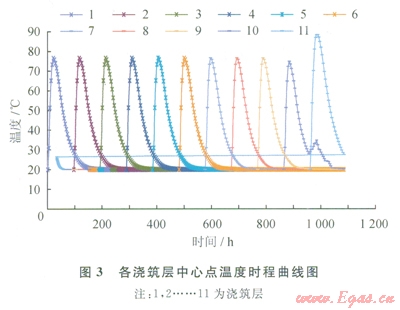 混凝土的內(nèi)部溫度與水泥種類、水灰比、初始條件、邊界條件、熱傳導系數(shù)等有關,還與位置、時間有關,有限元分析時采用式(1)對早齡期混凝土內(nèi)部的溫度場進行求解,各澆筑層中心點溫度時程曲線如圖3所示。