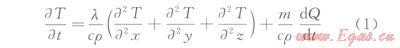 混凝土的熱傳導是一個瞬態(tài)過程,溫度場是齡期和空間函數(shù),混凝土中三維不穩(wěn)定溫度場的熱傳導微分方程為: