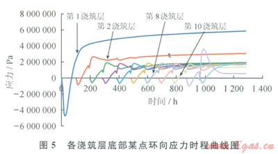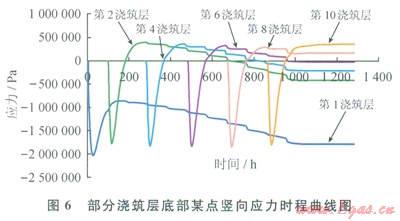 圖5為各澆筑層底部某點環(huán)向應力時程曲線,圖6為部分澆筑層底部某點豎向應力時程曲線。由圖5可知,在LNG儲罐外罐施工期間,溫度應力分為壓應力發(fā)展、壓應力轉(zhuǎn)變?yōu)槔瓚袄瓚呌跉堄鄳?/span>3個階段。比較圖5和圖6可知,混凝土外罐在溫度及重力荷載作用下,第一主應力為環(huán)向應力,與彈性力學理論分析的結(jié)果相符,而且現(xiàn)場施工經(jīng)驗表明混凝土外罐在施工期間底部經(jīng)常產(chǎn)生豎向裂縫。由圖5還可知,第1澆筑層所受的溫度應力明顯大于其他澆筑層,產(chǎn)生這種狀況的原因是第1澆筑層混凝土受到罐底的約束度相對較大;因第3~9澆筑層澆筑高度及約束狀況相近,所以其應力變化曲線相似;第10澆筑層環(huán)向應力曲線因受環(huán)梁澆筑的影響而產(chǎn)生2MPa的應力波動。