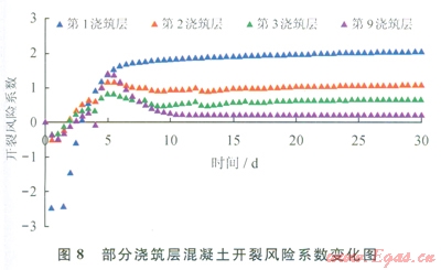 根據(jù)溫度應力預測和判斷混凝土是否發(fā)生開裂,采用開裂風險系數(shù)評估,一般認為當開裂風險系數(shù)達到0.7時,混凝土開裂的可能性已經(jīng)很大。