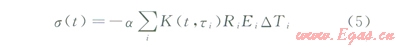 式(5)對應于第i時間段,a為混凝土熱膨脹系數(shù),1/℃;K(ti,t)為應力松弛系數(shù);Ri為約束系數(shù),其值與構件長高比及混凝土彈性模量比有關;Ei為彈性模量,MPa;DTi為混凝土的內(nèi)外溫差,℃。