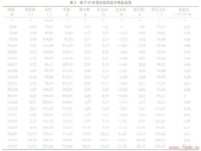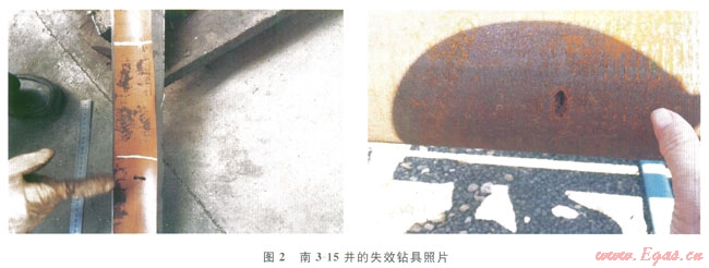 中國(guó)石油大慶鉆探工程公司(以下簡(jiǎn)稱(chēng)大慶鉆探)在冀東油田同時(shí)施工作業(yè)了4口井,分別使用同一廠家同批新鉆具,南3-15井[3]從201 3年7月1日起連續(xù)發(fā)生3起鉆具刺漏事件,刺漏位置均為母扣接頭以下0.4~0.6m的位置(圖2)。而其他3口井則沒(méi)有發(fā)生鉆具刺漏事件。其后技術(shù)交流過(guò)程中,廠商的解釋為井斜狗腿度偏大,而現(xiàn)場(chǎng)鉆井工程師卻列舉了一系列深井狗腿更大、使用同樣規(guī)格鉆具的其他廠家鉆具卻沒(méi)有發(fā)生失效,雙方對(duì)失效原因的認(rèn)識(shí)無(wú)法達(dá)到基本一致。表3為該井的造斜段數(shù)據(jù)。