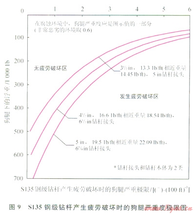 2010年的GB/T 24956~2010《石油天然氣工業(yè)鉆柱設(shè)計(jì)和操作限度的推薦作法》標(biāo)準(zhǔn)[9]中就曾給出井眼狗腿嚴(yán)重度和狗腿下的浮重對(duì)產(chǎn)生疲勞極限的線圖,其中S135鋼級(jí)幾種尺寸鉆具參考圖9。