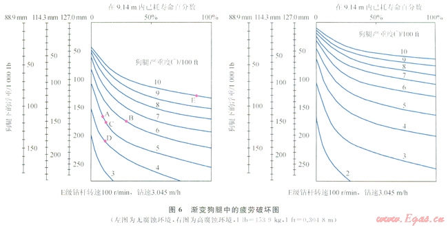 其后Hansford和Lubinski提出過(guò)一種簡(jiǎn)易的方法來(lái)估算鉆桿通過(guò)狗腿段后的累積疲勞損傷,定制了腐蝕介質(zhì)和非腐蝕介質(zhì)中E級(jí)鉆桿在不同狗腿嚴(yán)重度和拉力下消耗的壽命[9](圖6,參見(jiàn)GB/T 24956—2010《石油天然氣工業(yè)鉆柱設(shè)計(jì)和操作限度的推薦作法》第68頁(yè))。在不同轉(zhuǎn)速和鉆速情況下,可用下面公式進(jìn)行校正。