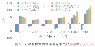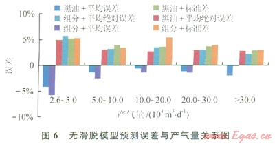 無滑脫模型各項(xiàng)誤差次之(圖4),組分模型計(jì)算誤差大于黑油模型,是由于Govier-Fogarasi用的凝析氣井液氣比為0.05~14.4m3/104m3,從黑油模型對(duì)所選模型(無滑脫、Gray和Hagedorn&Brown沒有劃分流型)計(jì)算流型看:Mukherjee&Brill和Orkiszewski所有井井簡(jiǎn)全部為段塞流,Hasan&Kabir預(yù)測(cè)結(jié)果除5井次出現(xiàn)分散泡狀流以外,其余井全為環(huán)狀流。段塞流為一段氣一段液,而環(huán)狀流主要靠氣相中攜帶的液滴和氣相與管壁液膜的摩擦帶液。因此兩種流型的滑脫損失均較小,可以采用無滑脫模型計(jì)算壓降。從分段液氣比看,液氣比小于0.5m3/104m3,誤差較大,這主要是由于氣液比極高,舉升壓降極小,13口壓降梯度平均為1.74MPa/1000m,導(dǎo)致井底流壓(13口井底流壓平均13.4MPa)較小,即使計(jì)算的井底流壓誤差較小因井底流壓測(cè)壓值較小而誤差較大。隨著液氣比的增加,各項(xiàng)誤差逐漸增加(圖5)?,F(xiàn)考慮各項(xiàng)誤差限為5%,采用無滑脫模型的液氣比范圍為0.5~5m3/104m3,并對(duì)該氣液比條件下的產(chǎn)氣量進(jìn)行了分段統(tǒng)計(jì)如圖6所示,隨著產(chǎn)氣量的增加,各項(xiàng)誤差逐漸下降。因此無滑脫模型按黑油計(jì)算適用條件為:液氣比0.5~5m3/104m3,產(chǎn)氣量大于5×104m3/d,井底流壓誤差小于5%。
