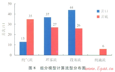 從所選的4個(gè)氣液兩相流模型(Hagedorn&Brown、Orkiszewski、Mukherjee&Brill、Hasan&Kabir)看,Hagedorn&Brown模型各項(xiàng)誤差最小,按組分模型計(jì)算的誤差明顯小于黑油模型。為了討論組分模型對(duì)流型、凝析油流量的影響,現(xiàn)選用誤差較小且考慮流型的Mukherjee&Brill進(jìn)行統(tǒng)計(jì)分析。分別按組分模型和黑油模型計(jì)算的井筒最大產(chǎn)油量如圖7所示,組分模型計(jì)算的井筒最大產(chǎn)油量明顯較地面測(cè)試產(chǎn)油量大得多,而按黑油模型計(jì)算的產(chǎn)油量明顯偏小,說明隨井筒向上流動(dòng)過程中,壓力溫度降低導(dǎo)致了凝析油的析出,與實(shí)際情況一致;井筒流量的改變使流型發(fā)生明顯變化,黑油模型計(jì)算的井筒流型全部為段塞流,組分模型計(jì)算時(shí)井底高溫高壓凝析油未析出或析出較少,以純氣流、環(huán)霧流和段塞流為主,所占井次比例依次下降,而井口主要流型未變,但各流型的井次比例呈明顯的反比關(guān)系(圖8),使按組分模型計(jì)算的各項(xiàng)誤差明顯小于黑油模型。