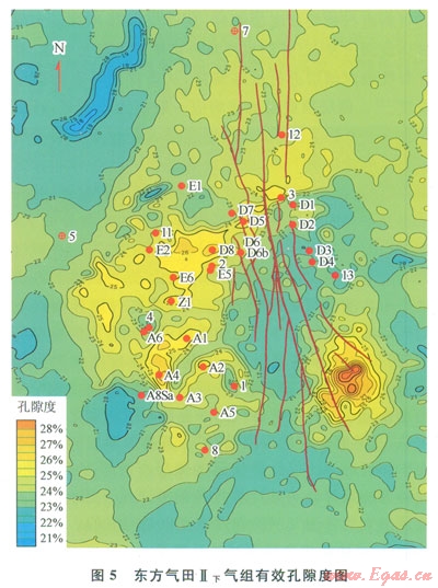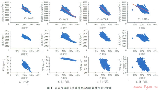 在進(jìn)行儲(chǔ)層孔隙度橫向描述之前,需要進(jìn)行了大量的儲(chǔ)層物性研究工作。研究的目的是通過分析儲(chǔ)層物性和與地震資料有直接關(guān)系的儲(chǔ)層的速度、密度和波阻抗等地震屬性的相關(guān)關(guān)系,來建立起合理的井震關(guān)系[14]。中海石油(中國)有限公司湛江分公司西部東方氣田各氣組單井孔隙度與地震的波阻抗、速度和密度都有一定的相關(guān)性。圖4為東方氣田多井分氣組進(jìn)行的孔隙度與地震的波阻抗、速度和密度的相關(guān)分析結(jié)果,從圖4上可以看出各氣組儲(chǔ)層的孔隙度與這幾種地震屬性有較好的相關(guān)關(guān)系,其中Ⅱ上氣組孔隙度和波阻抗的相關(guān)關(guān)系高達(dá)0.82,這說明東方氣田儲(chǔ)層的孔隙度與地震屬性有較好的相關(guān)性。因此,可以利用與地震屬性的相關(guān)性預(yù)測儲(chǔ)層孔隙度的方法來描述孔隙度的橫向變化。通過抽井檢驗(yàn)和儲(chǔ)量對(duì)比等方式檢查認(rèn)為各個(gè)氣組的孔隙度預(yù)測結(jié)果均為合理結(jié)果(圖5)。