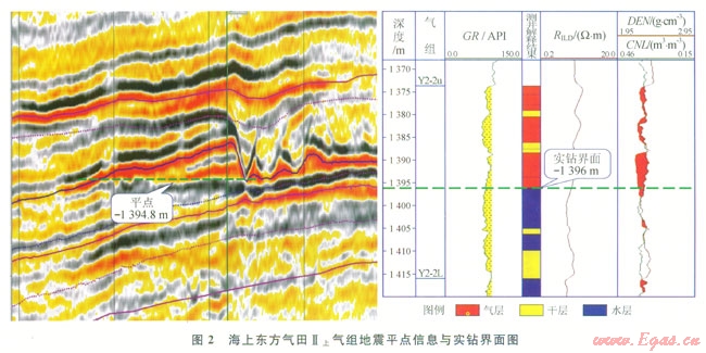 研究表明,在一定的地質(zhì)條件下砂體含氣后在地震資料上表現(xiàn)為明顯的“亮點(diǎn)”效應(yīng),氣層的振幅異常能較好地反映砂體的含氣情況川。在鶯歌海盆地的多個(gè)淺層氣藏實(shí)際鉆井資料證實(shí),鉆在振幅“亮點(diǎn)”范圍內(nèi)的井,其目的層均含氣。低部位如受氣水界面控制,同一種地震屬性在氣水邊界之上和之下表現(xiàn)出來的響應(yīng)有很大差異,形成“平點(diǎn)”現(xiàn)象,根據(jù)該平點(diǎn)信息可確定氣水界面。測井解釋結(jié)果也證實(shí)該界面是可靠的。如圖2所示,東方氣田的Ⅱ上氣組,根據(jù)平點(diǎn)信息確定的氣水界面為海拔-1394.6m,根據(jù)該界面圈定的含氣范圍內(nèi)有明顯的“亮點(diǎn)效應(yīng)”,實(shí)際井鉆遇的氣水界面為海拔-1396.0m,證實(shí)在該區(qū)域可以依據(jù)三維地震資料的亮點(diǎn)效應(yīng)和平點(diǎn)現(xiàn)象來確定氣水界面,從而確定氣田的含氣面積。該方法可以應(yīng)用在沒有實(shí)鉆界面的其他氣組或鄰近相似氣田,來彌補(bǔ)海上氣田鉆井工作量相對(duì)少引起資料不足的缺陷。