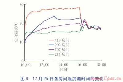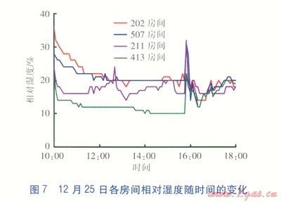 12月25日10:00室內(nèi)溫度為8.94℃,之后溫度一直處于上升趨勢(shì),至13:05上升至24℃,之后基本維持在20℃左右,至18:00室內(nèi)溫度為16.19℃。相對(duì)濕度基本在20%左右。
