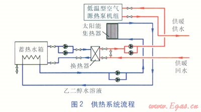 該建筑為拉薩市某多層辦公建筑,建筑共5層,總建筑面積為7500m2,辦公建筑典型層的平面布置見(jiàn)圖1。供暖方式采用以太陽(yáng)能熱水系統(tǒng)為主、空氣源熱泵為輔的形式,室內(nèi)供暖裝置為風(fēng)機(jī)盤管。供暖室內(nèi)設(shè)計(jì)溫度為20℃,供、回水溫度為45、40℃。供熱系統(tǒng)流程見(jiàn)圖2。乙二醇水溶液經(jīng)過(guò)太陽(yáng)能集熱器(平板形)加熱后進(jìn)入蓄熱水箱,蓄熱水箱出水經(jīng)板式換熱器與供暖回水換熱。若換熱后的水溫低于45℃,低溫型空氣源熱泵啟動(dòng),將水溫加熱至45℃后供給末端風(fēng)機(jī)盤管;若換熱后的水溫達(dá)到45℃,低溫型空氣源熱泵不啟動(dòng),熱水直接供給末端風(fēng)機(jī)盤管。
