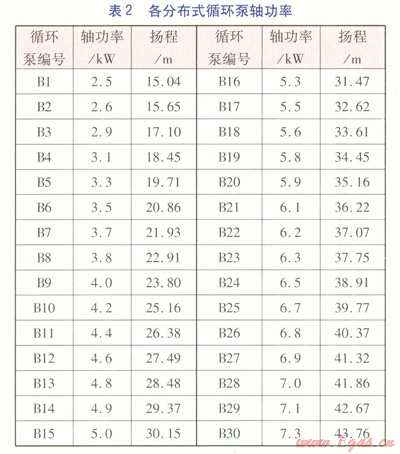 對于分布式循環(huán)泵供熱系統(tǒng),將零壓差點設(shè)定在熱源出口。熱源循環(huán)泵的質(zhì)量流量與傳統(tǒng)供熱系統(tǒng)循環(huán)泵質(zhì)量流量一致,為1290t/h;揚程僅用于克服熱源內(nèi)部水頭損失,因此熱源循環(huán)泵揚程為15m。經(jīng)計算,設(shè)計工況下熱源循環(huán)泵軸功率為75.3kW。分布式循環(huán)泵的質(zhì)量流量為其所在支路熱力站的質(zhì)量流量,揚程用于克服熱力站的水頭損失,以及熱力站之前的一切管網(wǎng)水力損失。經(jīng)計算,設(shè)計工況下各分布式循環(huán)泵的軸功率見表2。