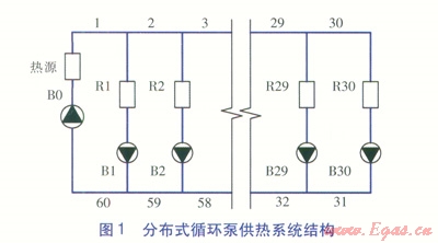 某供熱系統(tǒng)共有30座熱力站,供、回水設(shè)計溫度為l30、70℃,各熱力站設(shè)計熱負荷均為3MW,水頭損失均為10m,各熱力站所在支管長度為400m,支管水頭損失為4.38m,熱源內(nèi)部水頭損失為15m。分布式循環(huán)泵供熱系統(tǒng)結(jié)構(gòu)見圖1,圖中R1~R30為熱力站編號,1~60為干管管段編號,80為熱源循環(huán)泵編號,81~B30為分布式循環(huán)泵編號。若取消分布式循環(huán)泵,則分布式循環(huán)泵供熱系統(tǒng)則變成傳統(tǒng)供熱系統(tǒng)。各干管管段計算參數(shù)見表1,各干管管段長度均為100m。各熱力站所在支管的比摩阻均為42.1Pa/m,供熱系統(tǒng)中所有水泵的效率均按0.7計算。