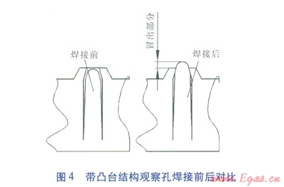 優(yōu)化設計后帶凸臺結構觀察孑L焊接前后對比簡易示意見圖4。
