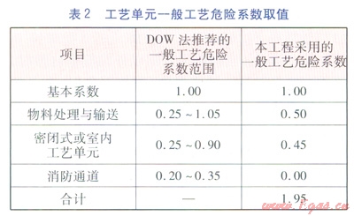 ⑤本工藝單元的一般工藝危險系數(shù)取值見表2。一般工藝危險系數(shù)F1等于表2中采用的所有一般工藝危險系數(shù)之和,計算得F1=1.95。