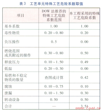 (11)本工藝單元的特殊工藝危險系數(shù)取值見表3。特殊工藝危險系數(shù)F2等于表3中采用的所有危險系數(shù)之和,計算得F2=3.51。