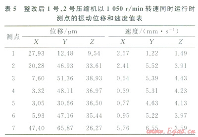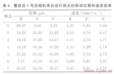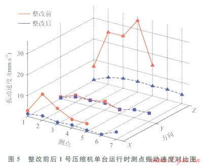 按照圖3的整改參數(shù)完成了工藝管線的現(xiàn)場整改,整改前后現(xiàn)場如圖4所示。為評價減振理效果,完成了1號壓縮機單臺運行和1號、2號壓縮機同時運行兩種工況的現(xiàn)場測試。測點的布置情況如圖4所示,測點的方向與整改前一致,其中1號壓縮機單臺運行參數(shù)及測點的振動位移和速度值分別見表3、4,1號、2號壓縮機同時運行時測點的振動位移和速度值見表5,整改前后l號壓縮機單臺運行時測點振動速度對比圖如圖5所示。