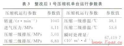 數(shù)據(jù)分析得出:①由圖5知,工藝管線整改后,1號壓縮機單臺運行時管線的振動位移和速度大大降低,最大位移為47.2mm,最大振動速度為5.18mm/s,遠低于限定值;②相比1號壓縮機單臺運行而言,1號、2號壓縮機同時運行時工藝管線的振動略微增加,最大位移為65.87mm,最大速度為6.55mm/s,但都在標準范圍之內(nèi);③1號壓縮機單臺運行時,測點B處的波峰壓力為4.128MPa,波谷壓力為4.115MPa,壓力不均勻度為0.3%,低于壓力脈動限制值0.54%(API 618);④由于1號、2號兩臺壓縮機同時運行時,處理量達到了119.52×104m3/d,增壓站的處理能力得到較大提升;⑤另外,3號、4號壓縮機共用另一匯氣管,工藝管線振動情況與1號、2號壓縮機運行時基本一致,管線振動也滿足標準要求。
