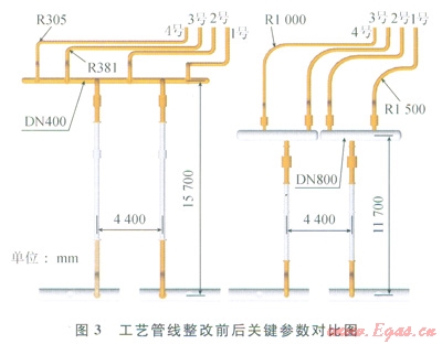 結(jié)合現(xiàn)場實際,從消減激振力{F}、管線設(shè)計相關(guān)標準和現(xiàn)場操作工藝方面綜合分析,確定了如下的治理措施:①考慮設(shè)備檢修和倒流程操作,采用2個獨立的匯氣管,2個匯氣管出口分別連接到1號、2號和3號、4號壓縮機;②按照一般匯氣管的流通面積應(yīng)大于進氣管流通面積總和3倍的要求,增加匯氣管直徑和緩沖容積[12];③減少彎頭以及增加彎頭的曲率半徑;④縮短管線長度以增加管線剛度、合理布置支承。工藝管線整改前后關(guān)鍵參數(shù)對比如圖3所示。