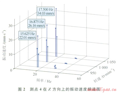 導(dǎo)致管線振動因素很多,主要有管線系統(tǒng)結(jié)構(gòu)的固有頻率落在共振區(qū)引發(fā)的機械共振,管流的氣柱同有頻率落在共振區(qū)引發(fā)的氣柱共振,壓力脈動過大引起的管道振動,以及動力平衡性差引起的振動[7]。為了全面分析工藝管線振動的原因,根據(jù)機組的實際情況,采用便攜式振動測試儀對管線的關(guān)鍵部位進行了現(xiàn)場測試。振動測點1~5的位置及方向、壓力脈動測點A的位置見圖1。測試工況為:①1號壓縮機在3種不同轉(zhuǎn)速下單臺運行;②1號壓縮機轉(zhuǎn)速為1050r/min,窄載和負載運行;③測點A處的壓力脈動測試。測試結(jié)果包括測點的振動位移、振動速度、壓力脈動以及測點振動速度的頻譜特性。鑒于測試數(shù)據(jù)較多,只列出了具有代表性的測試結(jié)果,其中1號壓縮機運行參數(shù)和測點的振動值分別見表1、2,測點4在Z方向的振動速度頻譜見圖2。結(jié)合國內(nèi)外機械振動測量與評價的相關(guān)標準,確定管線振動烈度級為18,振動位移界限值為283mm,振動速度界限值為17.8mm/s[8-9]。