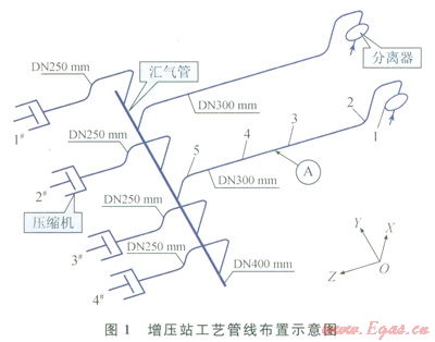 某增壓站是一座集采、集、輸、增壓功能為一體的大型集輸站,設(shè)計處理規(guī)模為183×104m3/d,設(shè)計壓力為8.0MPa。壓縮機組由3臺(1號、2號、3號)功率為1250kW和1臺(4號)功率為1030kW的大型往復(fù)式壓縮機組成,壓縮機結(jié)構(gòu)為水平對稱平衡型,采用燃氣發(fā)動機驅(qū)動。增壓站工藝管線布置情況如圖1所示,分離器出口管道與匯氣管連接,匯氣管出口管道與壓縮機連接。增壓站自投運以來,壓縮機組運行參數(shù)達到設(shè)計要求,但管道系統(tǒng)振動異常,無法運行多臺壓縮機組,嚴重制約了生產(chǎn)產(chǎn)量。雖采取了強化管道支承、加固連接底座等減振措施,但減振效果不佳。