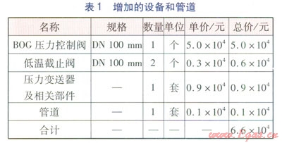 設置BOG壓力控制閥,需要增加一套BOG壓力控制系統(tǒng),即需要增加相應的設備和管道,因此相應的造價也要增加。增加的設備和管道見表1。