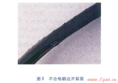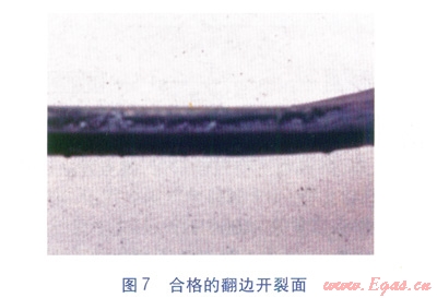 合格的判定:翻邊不開裂,或者即使開裂,開裂面是韌性開裂面(見圖7),判定為合格;翻邊發(fā)生開裂,并且開裂面是光滑平整的脆性開裂面(見圖8),判定為不合格。對于判定不合格的接頭需割除接頭重新焊接,如果不合格的數量較多,但翻邊脆性開裂長度小于25%,則應該通過選取典型試件做拉伸性能試驗來最終確定該類焊接接頭是否合格。