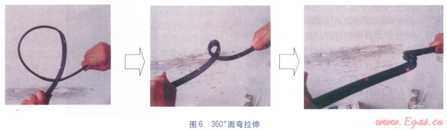 工程實踐中,我們通過與材料制造及熱熔連接設備廠家技術人員進行交流,發(fā)現(xiàn)采用360°的面彎并拉伸的方法(見圖6),可以將有質量問題的翻邊檢驗出來。這種方法在最后拉伸時會在熔合面上形成很大的剪切力,比180°背彎更有效。