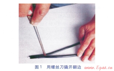 我單位于2012年敷設了一段DN 250mm聚乙烯燃氣管道(SDR11 PE100),依照規(guī)范的規(guī)定對某熱熔對接連接接頭質量進行了檢驗,在翻邊對稱性檢驗和接頭對正性檢驗均合格的前提下,對其進行了翻邊切除檢驗,切削下來的翻邊條外觀檢驗合格,翻邊背彎(每隔50mm進行180°背彎)試驗時,亦未出現(xiàn)開裂、裂縫及熔合線裸露,該對接接頭質量判定為合格。但偶然情況下,發(fā)現(xiàn)該檢驗合格的翻邊,使用一字形螺絲刀可以在局部某一段沿熔合面撬開(見圖1),而且分開的熔合面光滑平整,我們推斷該接頭質量不合格。于是,對所有已經完成的且檢驗合格的對接接頭翻邊進行了加強檢查,包括一字形螺絲刀撬、最大限度的扭曲拉伸等,這樣又找到了多個同類問題的翻邊。由此,對規(guī)范規(guī)定的翻邊切除檢驗方法能否有效證明熱熔對接連接接頭質量合格提出了疑問。