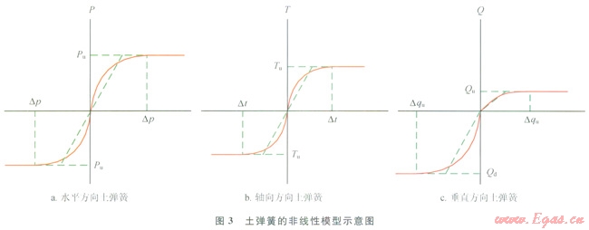 根據(jù)ASCE Guidelines.for the Design of Buried Steel Pipe[21,斷層作用下,土壤對管道的作用可以用彈塑性土彈簧來表示,包括管道軸向、側(cè)向和垂向的土彈簧(圖2)。筆者采用管土相互作用(PSI)單元模擬管土相互作用,PSl單元如圖2-b所示,由4個節(jié)點組成,單元上端2個節(jié)點(3和4)與地表面相連,反映地面運動與位移,下端2個節(jié)點(1和2)與管道單元相連,管土相互作用關(guān)系以非線性單元剛度表示,單元剛度與土彈簧剛度一致。通過將斷層位移施加在斷層右側(cè)PSI單元的土壤節(jié)點上可以來模擬斷層的作用。等效土彈簧的力學性能可以用極限抗力與屈服位移2個量來描述。Pu、Tu、Qu和Qd代表了3個方向的極限抗力,Dp、Dt、Dqd和Dqu代表了3個方向的屈服位移(圖3)。