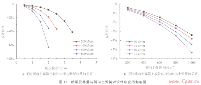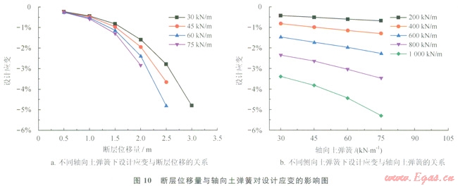 通過研究不同土彈簧的取值影響來考慮土壤特性對管道設(shè)計應(yīng)變的影響,圖10給出了不同軸向和側(cè)向土彈簧下設(shè)計應(yīng)變的變化規(guī)律。由圖10-a可以得到,軸向土彈簧越大,設(shè)計應(yīng)變越大。在不同軸向土彈簧下管道設(shè)計應(yīng)變隨斷層位移量的變化形式保持一致,依舊保持著類似冪函數(shù)的關(guān)系。這里分析不同側(cè)向土彈簧下應(yīng)變隨軸向土彈簧的變化規(guī)律來分析軸向和側(cè)向土彈簧的相互影響,從圖10-b可以發(fā)現(xiàn),在不同側(cè)向土彈簧下設(shè)計應(yīng)變隨軸向土彈簧保持單調(diào)的規(guī)律,軸向土彈簧越大設(shè)計應(yīng)變越大,同時側(cè)向土彈簧越大設(shè)計應(yīng)變也越大。