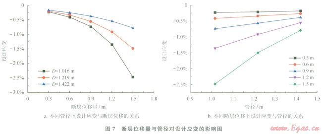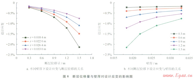 圖7、8給出了不同斷層錯動位移下管徑和壁厚對設(shè)計應(yīng)變的影響。從圖7-a和圖8-a可以看出,管徑和壁厚越大,設(shè)計應(yīng)變越小,但在不同的管徑和壁厚下設(shè)計應(yīng)變和斷層錯動量都保持著相似的函數(shù)關(guān)系。圖7-b和圖8-b給出了不同斷層位移下設(shè)計應(yīng)變與管徑和壁厚的變化規(guī)律,可以看出,設(shè)計應(yīng)變隨管徑和壁厚的變化規(guī)律比較一致,也可以用冪函數(shù)來描述。