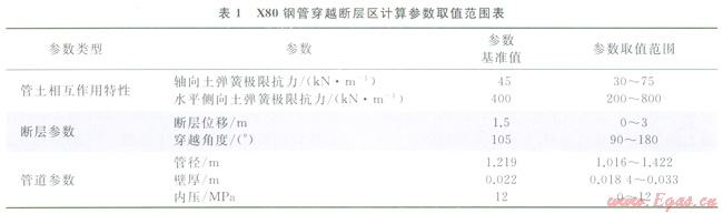 根據(jù)“西氣東輸二線”工程管道的實際運行參數(shù)與沿途斷層參數(shù),對模型計算參數(shù)進行取值,得到的模型計算參數(shù)范圍如表1所示。這里需要說明的是,直接研究斷層對管道在空間中造成的錯動雖然更加符合實際,但該情況下影響參數(shù)眾多,很難得到設(shè)計應(yīng)變與各影響參數(shù)間的準確關(guān)系與回歸公式。所以筆者只討論管道錯動分解后位于水平面內(nèi)的情況。當分析管道在水平面內(nèi)錯動時,垂直向上與向下的土彈簧對管道的應(yīng)變不再產(chǎn)生任何影響,所以可以不用考慮。而管道的軸向土彈簧與側(cè)向土彈簧的取值范圍由“西氣東輸二線”中出現(xiàn)的管道埋深、回填土和場地土性質(zhì)參考ASCE Guidelines for the Design 0/Buried Steel Pipe方法進行計算確定??梢缘玫礁鲄?shù)取值范圍如表1所示。