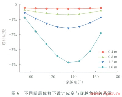 為了更深入分析設(shè)計應(yīng)變與穿越角度的關(guān)系,圖6給出了不同斷層位移下設(shè)計應(yīng)變隨穿越角度的變化關(guān)系。從圖6可以看出,當斷層位移量小于0.8m時,設(shè)計應(yīng)變較小,變化也較小;當斷層位移量大于0.8m時,設(shè)計應(yīng)變隨著穿越角度的增大先增大后減小,在所有斷層位移下,設(shè)計應(yīng)變與穿越角度之間存在著相似的函數(shù)關(guān)系,可以用二次多項式來描述。