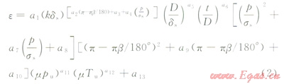 基于有限元分析結(jié)果,給出了穿越角度大于90°時跨斷層區(qū)X80鋼管設(shè)計應(yīng)變的回歸公式。根據(jù)參數(shù)分析得到的各參數(shù)對設(shè)計應(yīng)變的影響規(guī)律可以得到設(shè)計應(yīng)變的回歸公式形式如下: