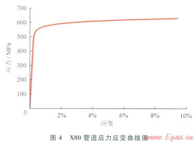 式中E為管材的初始彈性模量;e為應(yīng)變;s為應(yīng)力;ss為管材的屈服應(yīng)力;a和N為R-O模型參數(shù)。對X80鋼管材拉伸實驗結(jié)果的真實應(yīng)力應(yīng)變曲線下限值進行擬合[10],得到參數(shù)取值如下:E=206000MPa;ss=2552MPa;a=0.86;N=28。管道真實應(yīng)力應(yīng)變關(guān)系如圖4所示。