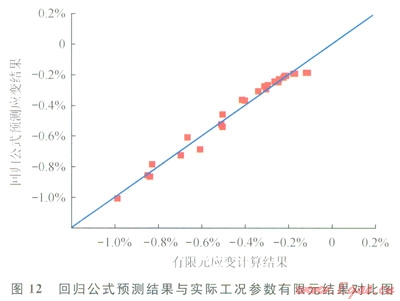 為了驗證公式的準確性,本使用“西氣東輸二線”工程中30種工況參數(shù)的應(yīng)變計算結(jié)果進行對比分析(圖12),從圖12中可以發(fā)現(xiàn)本文給出的回歸公式精度較高,可以對穿越角度大于90°時跨斷層區(qū)XS0鋼管的設(shè)計應(yīng)變進行預(yù)測。