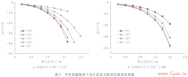 圖5為不同穿越角度下設(shè)計應(yīng)變與斷層位移的關(guān)系圖,圖5表明,管道的設(shè)計應(yīng)變在所有大于90°的穿越角度下都隨著斷層位移的增大而增大。隨著斷層位移的加大,設(shè)計應(yīng)變增大速度變快。當穿越角度小于135°時,角度越大設(shè)計應(yīng)變越大,設(shè)計應(yīng)變隨斷層位移的變化速度越快;當穿越角度大于135°時,角度越大設(shè)計應(yīng)變越小,設(shè)計應(yīng)變隨斷層位移的變化速度越慢??梢缘玫剑谒写┰浇嵌认?,設(shè)計應(yīng)變與斷層位移均表現(xiàn)為近似冪函數(shù)關(guān)系。
