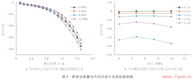 考慮0MPa、4MPa、8MPa、12MPa這4種不同內(nèi)壓工況下設(shè)計應(yīng)變的變化規(guī)律。由有限元結(jié)果可以得到,設(shè)計應(yīng)變在不同內(nèi)壓下隨斷層位移的變化規(guī)律比較類似(圖9)。為了進一步分析內(nèi)壓對設(shè)計應(yīng)變的影響,分析了不同斷層位移下設(shè)計應(yīng)變隨內(nèi)壓的變化情況。從圖9-b可以看出,當斷層位移量大于1m時,設(shè)計應(yīng)變在4MPa時應(yīng)變最?。划敂鄬游灰屏啃∮?/span>1m時,設(shè)計應(yīng)變較小,不同內(nèi)壓下設(shè)計應(yīng)變的差距變得不大明顯。