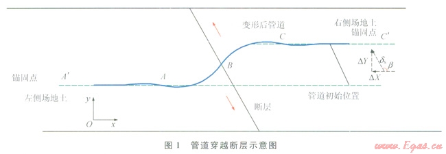 活動斷層是地震區(qū)天然氣長輸管道的主要威脅,斷層作用下管道會發(fā)生軸向和垂向位移,導致管道內(nèi)產(chǎn)生較大的應(yīng)變而失效。所以斷層作用下管道應(yīng)變的準確計算對斷層區(qū)管道的設(shè)計與安全評估具有重要意義。國內(nèi)外大量學者針對斷層區(qū)管道的應(yīng)力應(yīng)變分析進行了大量研究[1-12],提出了多種理論和數(shù)值計算方法,其中在工程中應(yīng)用最廣泛的為Newmark-Hall和Kennedy方法[3-4],但是其只能求解管道穿越角小于90°時的管道受拉情況,無法求解管道穿越角大于90°時管道的受壓情況。