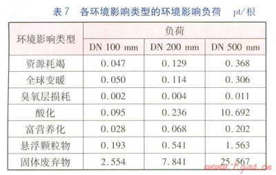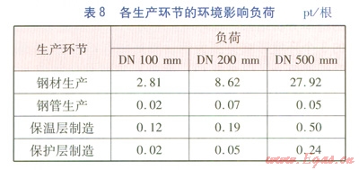 由表7可知,固體廢棄物對環(huán)境影響的貢獻(xiàn)最大,其次分別是懸浮顆粒物、酸化、全球變暖、資源耗節(jié)中鋼材生產(chǎn)的環(huán)境影響最大,其次是保溫層,最后是保護(hù)層和鋼管生產(chǎn)。主要原因是鋼材生命周期過程中礦石的開采和鋼鐵冶煉都會產(chǎn)生大量的固體廢棄物,這就造成固體廢棄物對環(huán)境影響比較大。在計算生產(chǎn)環(huán)節(jié)環(huán)境影響時,鋼材生產(chǎn)產(chǎn)生大量廢棄物,同時在此環(huán)節(jié)中,資源耗竭所占比重也比較大,因此鋼材生產(chǎn)就成為保溫管道生產(chǎn)階段環(huán)境影響最大的環(huán)節(jié)。公稱管徑100~500mm鋼材生產(chǎn)形成的環(huán)境影響負(fù)荷分別為2.81、8.62、27.92 pt/根。