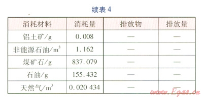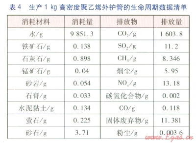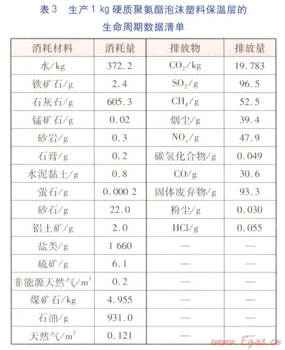 建材的含能(Embodied Energy)近年來在國外得到廣泛研究,含能是指產(chǎn)品從自然界原始材料的掘取,經(jīng)過運(yùn)輸、加工、組裝直至成品出廠前的所有相關(guān)過程的能耗總和,是基于生命周期的能耗統(tǒng)計數(shù)據(jù)。顧道金[14]利用國外含能數(shù)據(jù),建立了中國建筑產(chǎn)品外推含能數(shù)據(jù)表,并計算了我國能源使用背景下lMJ含能的生命周期數(shù)據(jù)清單。對于保溫層、外護(hù)管,在計算環(huán)境影響時都采用此種方法,生產(chǎn)1kg硬質(zhì)聚氨酯泡沫塑料保溫層、高密度聚乙烯外護(hù)管的生命周期數(shù)據(jù)清單(關(guān)鍵數(shù)據(jù))分別見表3、4。