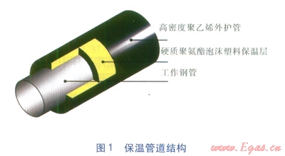 評價對象是以硬質(zhì)聚氨酯泡沫塑料作為保溫層,高密度聚乙烯作為外護(hù)管的保溫管道,具體結(jié)構(gòu)見圖1。選取規(guī)格為DN 100、200、500mm保溫管道進(jìn)行評價,工作鋼管長度均為12m。保溫管道各種技術(shù)參數(shù)執(zhí)行CJ/T 114—2000《高密度聚乙烯外護(hù)管聚氨酯泡沫塑料預(yù)制直埋保溫管》,3種規(guī)格保溫管道的具體技術(shù)參數(shù)見表1。