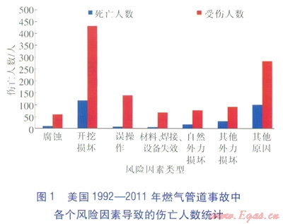 摘 要:以美國城市燃氣管道系統(tǒng)事故統(tǒng)計數(shù)據(jù)為例,將導致管道事故的風險因素按照7個類型進行分類,分析各個風險因素導致的管道事故數(shù)量以及產(chǎn)生的后果,對各個風險因素的風險進行計算和排序。分析了各個風險因素在管道建設與運行過程中的主要表現(xiàn)形式。