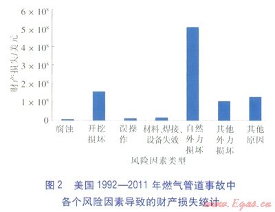 圖2顯示了美國1992—2011年燃氣管道事故中各個風險因素導致的財產(chǎn)損失統(tǒng)計,其中,自然外力損壞類事故造成財產(chǎn)損失最多,為5.06×108美元;腐蝕類事故造成的財產(chǎn)損失最小,為914.2×104美元。